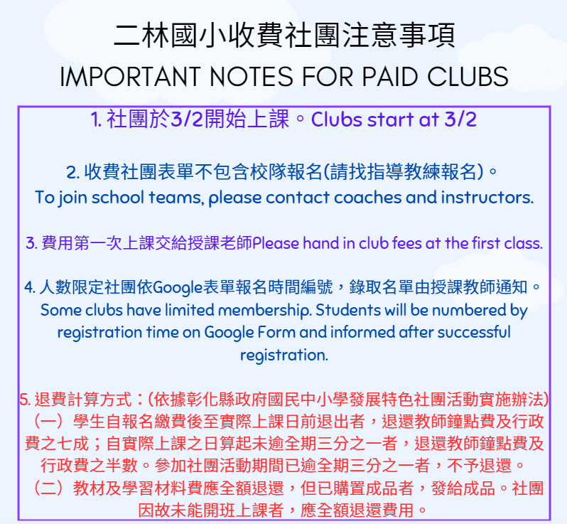 本學期收費社團招生限額如下 Limits of Clubs Member Numbers 收費社團於1/26日上午11點開放報名 Registration for Paid Clubs will begin at 11 AM, 1/26