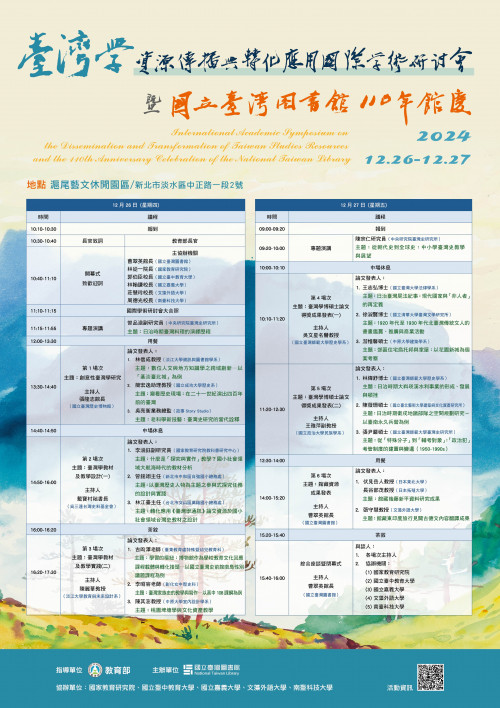| [類別] 標題 | [11312457] 轉知國立臺灣圖書館訂於本(113)年12月26日(星期四)至12月27日(星期五)舉辦「臺灣學資源傳播與轉化應用國際學術研討會暨國立臺灣圖書館110周年館慶」,請查照。 |