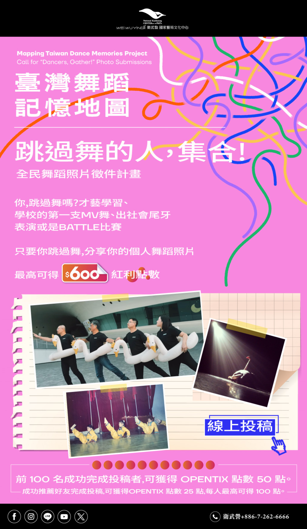 - 「跳過舞的人,集合!」全民舞蹈照片徵件活動參考簡章(附件二)或衛武營官網網址:https://npacwwy.tw/en08gMrIj,邀請師生共同參與投稿,擴大舞蹈記憶之蒐集與交流。