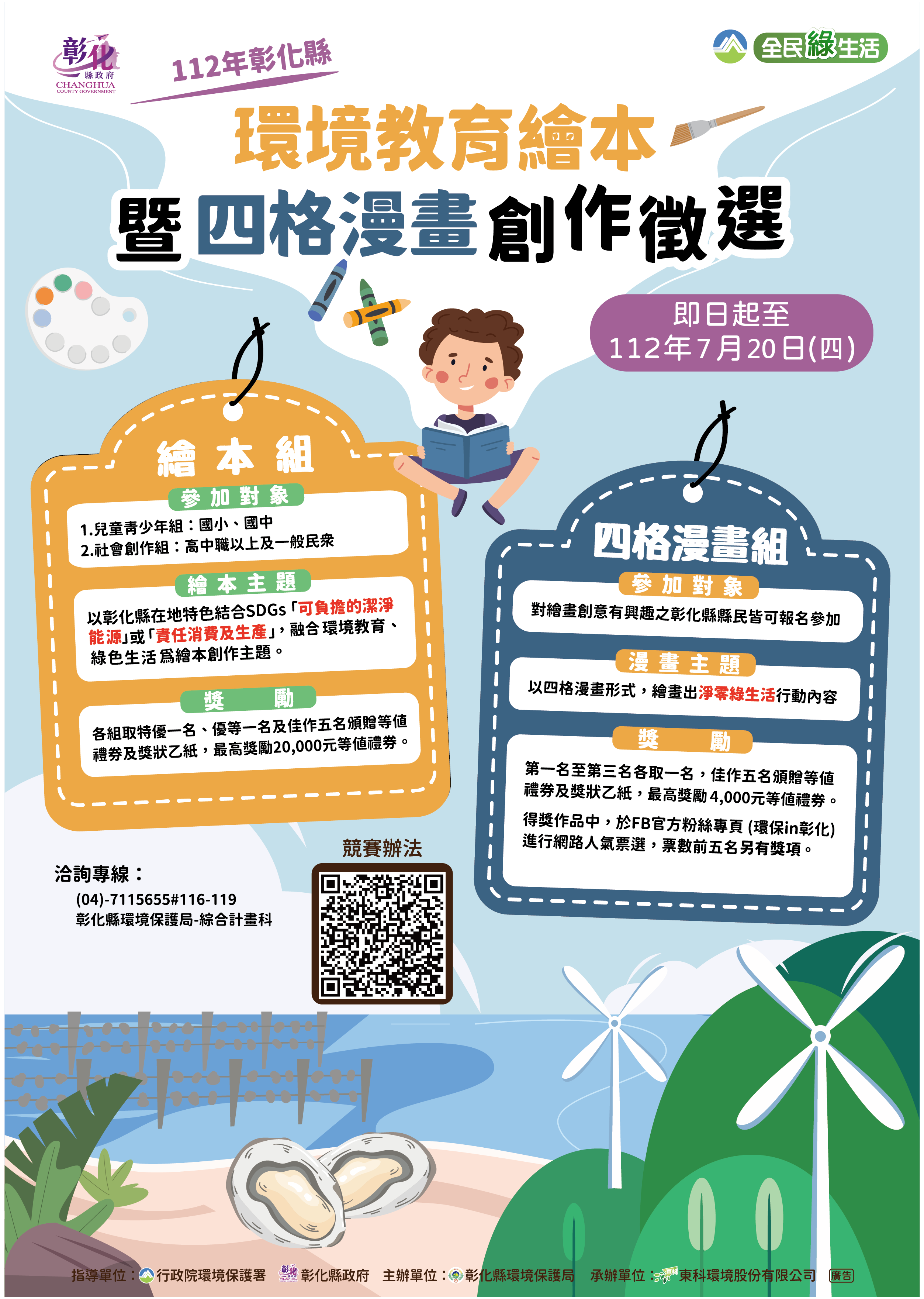 為增進民眾對環境議題及環保觀念之認知,藉由環境教育繪本引導,以彰化縣在地環境特色發想,鼓勵民眾發揮創意結合在地特色及環境議題,並發揮圖文並茂之創造力,寓教於樂,本局特辦理「彰化縣112年環境教育繪本暨四格漫畫徵選活動」,透過繪畫創作環境教育繪本及簡易的四格漫畫方式,展現環境連結及響應全民綠生活動,以達到共同維護環境永續之目的。 |